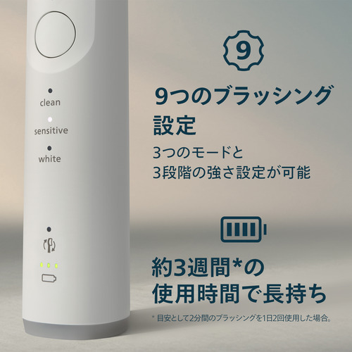使用時間:約 3 週間(満充電後、2 分間のブラッシングを1 日2 回の場合)