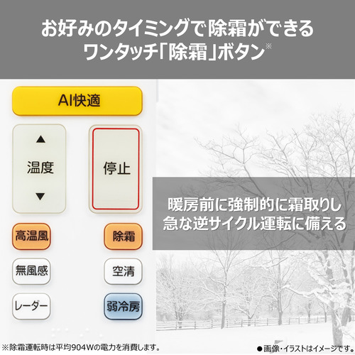 お好みのタイミングで除霜ができる、ワンタッチ「除霜」ボタン搭載 ※運転停止時のみ・除霜運転時は平均904Wの電力を消費します。