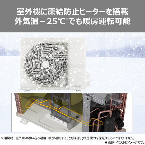 室外機に凍結防止ヒーターを搭載。外気温マイナス25度でも暖房運転可能!