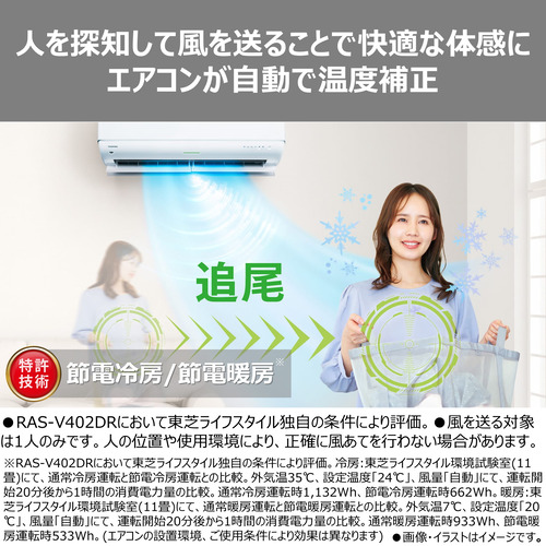 人を探知して風を送り快適な体感にしながらエアコンが自動で温度補正