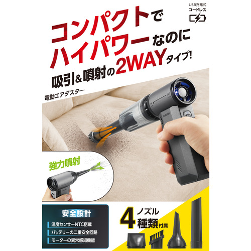 エレコム AD-ALC02BK 電動エアダスター 吸引機能付き 無段階風量 USB充電式 4種ノズル付 ブラック