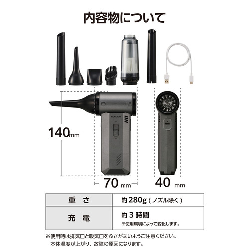 内容物:電動エアダスター本体、ダストボックス、クリーナーノズル、ブラシ付きノズル、大口径噴射ノズル、エアーノズル、USB-A - USB Type-C(TM)ケーブル