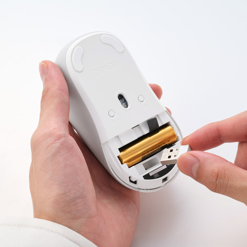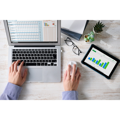 ●パソコンのUSB-Aポートにレシーバーを挿すだけの無線2.4GHz接続と、USB-Aポートのないパソコンやタブレットでも使えるBluetooth(R)接続の両方に対応するワイヤレスモデルです。