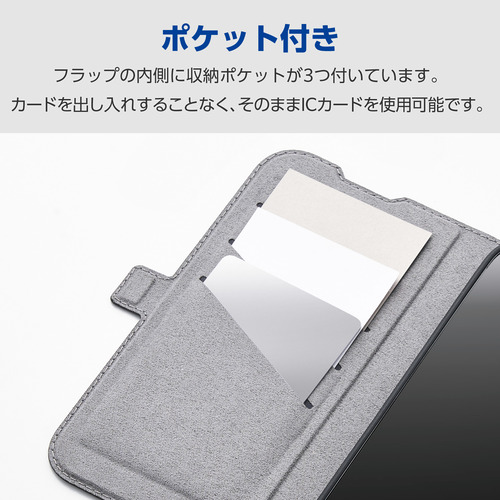 ●フラップの内側に、メモやカードなどが収納できるポケットが3つ付いています。カードを出し入れすることなく、そのままICカードを使用可能です。