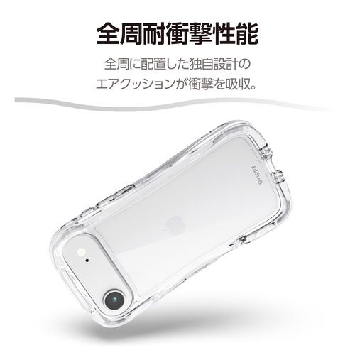 ●全周に配置した独自設計のエアークッションが衝撃を吸収し、背面には高硬度のポリカーボネート素材を採用。中央のくびれ形状に平坦な面を設けることで、手に馴染む快適なグリップ感を実現したGrippyシリーズのハイブリッドケースです。端末のデザインが美しく際立つオールクリアタイプです。