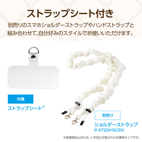 ●ショルダーストラップやハンドストラップが取り付けられる、ストラップホールシート(1つ穴・半透明タイプ)が付属しています。