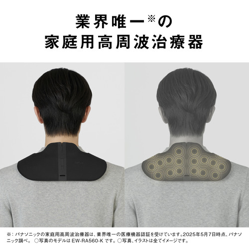・背中側だけでなく肩上、肩前から高周波パルスを立体的に照射。より効率的に肩コリを治療 ・薄型形状がしっかりと肩まわりの曲線にフィット
