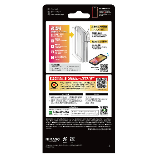 パッケージ内容:ガラスフィルム1枚、レンズフィルム1枚、貼付ガイド枠、クロス、ウェットクリーナー、ホコリ除去シール、保証カード