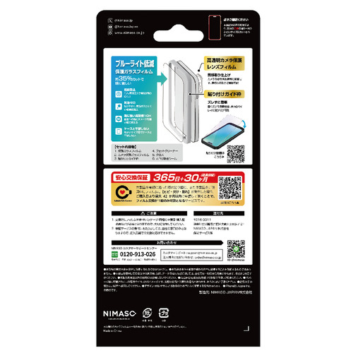 パッケージ内容:ガラスフィルム1枚、レンズフィルム1枚、貼付ガイド枠、クロス、ウェットクリーナー、ホコリ除去シール、保証カード