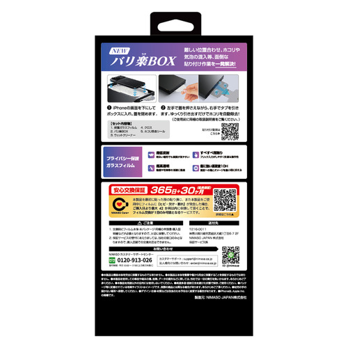 パッケージと一体化した「バリ楽Box」で今まで以上に貼付けがカンタンになりました。フィルムがセットされているバリ楽BoxにiPhoneを被せてシートを引っ張るだけで確実にフィルムを貼付けられます。貼付け前のクリーニングに便利なクロスやホコリ取りシールも付属しています。