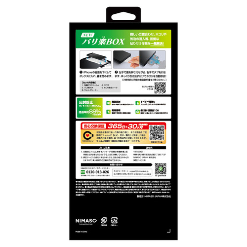 パッケージと一体化した「バリ楽Box」で今まで以上に貼付けがカンタンになりました。フィルムがセットされているバリ楽BoxにiPhoneを被せてシートを引っ張るだけで確実にフィルムを貼付けられます。貼付け前のクリーニングに便利なクロスやホコリ取りシールも付属しています。