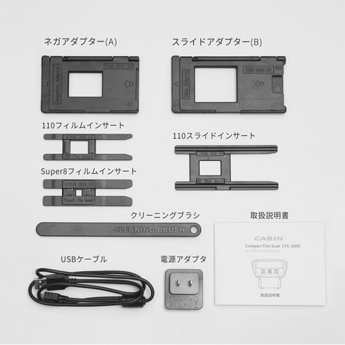 付属品:USBケーブル、電源アダプター、135フィルムネガホルダー、135フィルムスライドホルダー、 110スライドインサート、110フィルムインサート、Super8フィルムインサート、クリーニングブラシ、取扱説明書