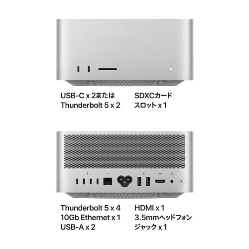 M3 Ultra搭載Mac Studioでは、6つのThunderbolt 5ポート、2つのUSB-Aポート、HDMIポート、SDXCカードスロット、ヘッドフォンジャックが使えます。