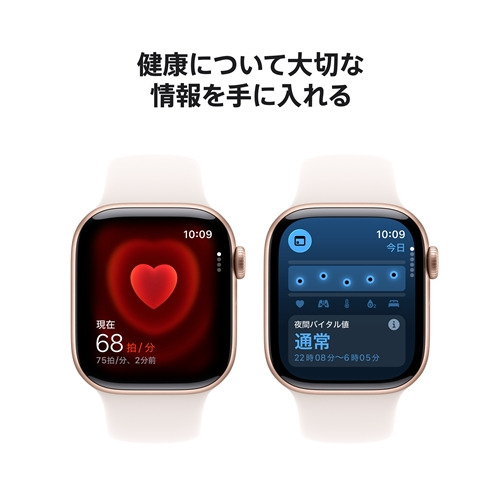 ※9 Apple Watch Series 11にはISO規格22810:2010にもとづく50メートルの耐水性能があります。これは、プールや海で泳ぐなど、浅水でのアクティビティで使用できることを意味します。スキューバダイビング、ウォータースキー、高速水流または低水深を超える潜水を伴うその他のアクティビティにはApple Watch Series 11を使用しないでください。耐水性能は永続的に維持されるものではなく、時間の経過とともに低下する可能性があります。詳しくはsupport.apple.com/ja-jp/109522をご覧ください。Apple Watch Series 11にはIP6X等級の防塵性能があります。