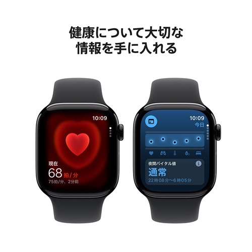 ※10 Apple Watch Series 11にはISO規格22810:2010にもとづく50メートルの耐水性能があります。これは、プールや海で泳ぐなど、浅水でのアクティビティで使用できることを意味します。スキューバダイビング、ウォータースキー、高速水流または低水深を超える潜水を伴うその他のアクティビティにはApple Watch Series 11を使用しないでください。耐水性能は永続的に維持されるものではなく、時間の経過とともに低下する可能性があります。詳しくはsupport.apple.com/ja-jp/109522をご覧ください。Apple Watch Series 11にはIP6X等級の防塵性能があります。