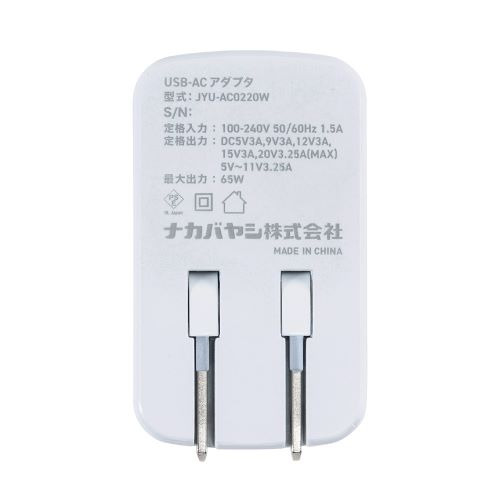 ナカバヤシ JYU-AC0220W USB Type-Cケーブル一体型 AC充電器 USB PD対応 65W PC タブレット スマホ対応 2.0m ホワイト
