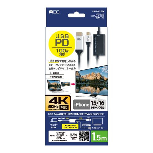 ナカバヤシ USD-P4K15BK USB Type-C - HDMI変換ケーブル 4K60Hz対応 USB PD対応 スマホやタブレットの画面をテレビで見られる