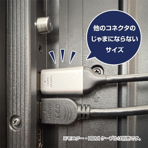本製品はUSB PD給電ユニットがコネクタから離れています。HDMI端子やType-C端子は通常サイズとなり、他のコネクタのじゃまになりません。