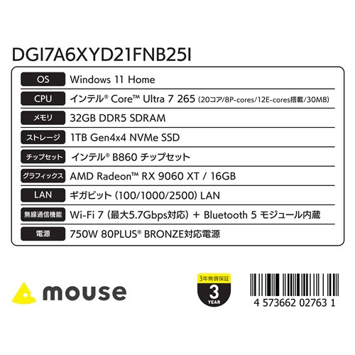 マウスコンピューター デスクトップPC G TUNE DGI7A6XYD21FNB25I[インテル Core Ultra 7 | 32GB | 1TB | Windows 11 Home | ブラック]