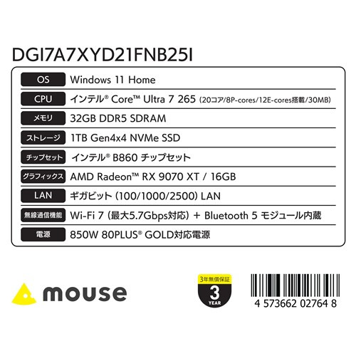 マウスコンピューター デスクトップPC G TUNE DGI7A7XYD21FNB25I[インテル Core Ultra 7 | 32GB | 1TB | Windows 11 Home | ブラック]