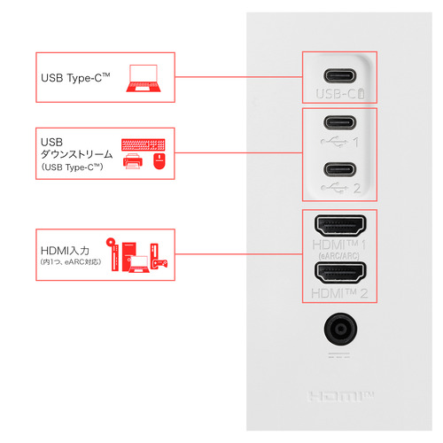 ●接続:出入力端子:HDMI入力×2、USB Type-C(USB PD 65W)×3、USBダウンストリーム(USB Type-C)×2 USB Type-C仕様:映像入力(DisplayPort Alt Mode)、給電(USB PD 65W)、データ転送 通信:Wi-Fi 5 (IEEE802.11a/b/g/n/ac)、Bluetooth5.0