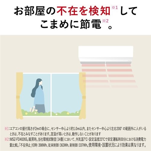 赤外線センサー「ムーブアイmirA.I.+」が人がいないことを検知すると、約3分で温度を抑えた弱めの運転に切替え。従来に比べて温度をセーブし、わずかな不在時間も見逃さずムダを省いて消費電力を抑制。人を検知すると元の運転へと復帰。