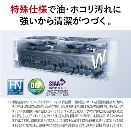 「よごれんボディ」ファンにホコリ汚れと油汚れを同時に防ぐ独自コーティングを施し、カビの原因になるホコリなどの付着を防ぎます。「おまかせボディ」冷房時に発生した結露水による自動洗浄のあと、運転停止後に熱で乾燥させることでカビを抑制します。「はずせるボディ」前面パネルやフラップを外すことができ、エアコンの内部を簡単にお手入れできます。