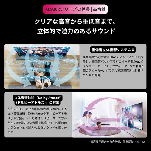 スピーカー(個数):2Wayメインスピーカー:6個(重低音パッシブラジエーター搭載)、トップスピーカー:2個