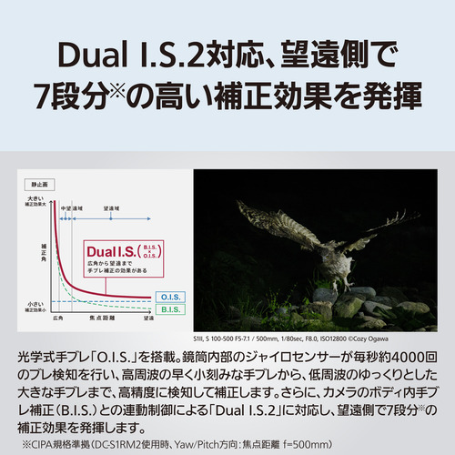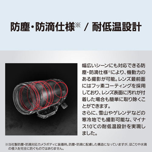 ・超望遠ズームレンズながら全長約196.1?の小型化を実現 ・機動力を活かす手ブレ補正性能「Dual I.S. 2」で7.0段(※CIPA規格準拠(DC-S1RM2使用時、Yaw/Pitch方向:焦点距離f=500mm)。※)、デュアルフェイズリニアモータ搭載による高速・高精度AFの実現