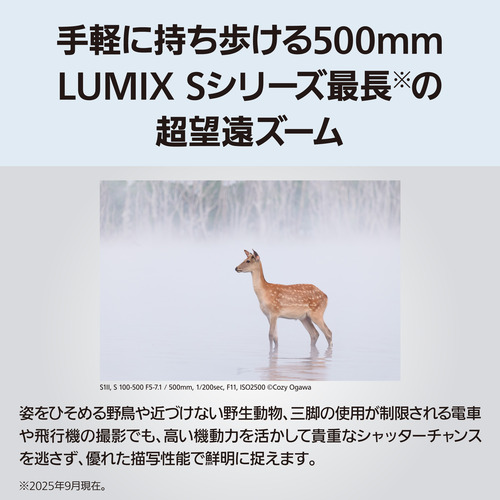 ●焦点距離500mmまでカバーするLUMIX Sシリーズレンズ初(※当社フルサイズイメージセンサー搭載ミラーレス一眼カメラ向け交換レンズにおいて。2025年11月中旬発売予定。当社調べ。※)の超望遠ズームレンズ。野生動物から鉄道まで幅広いシーンでの撮影が可能