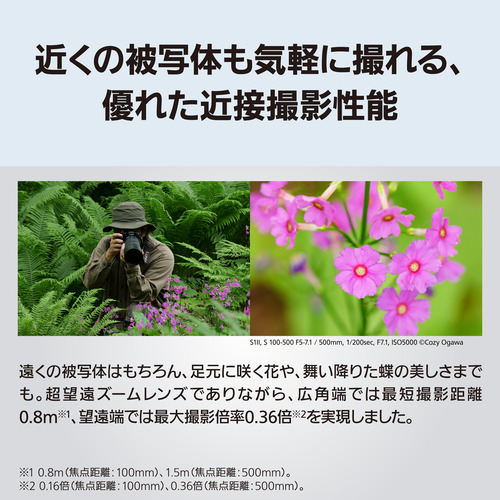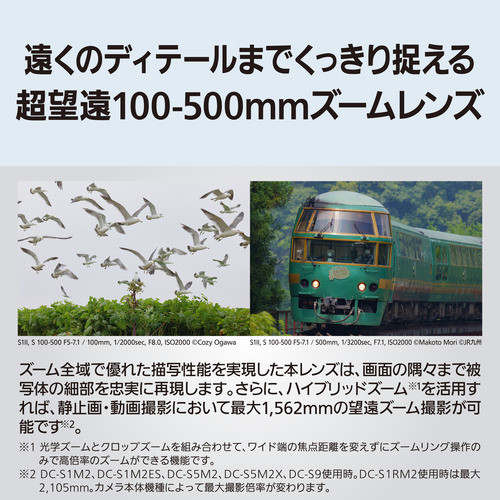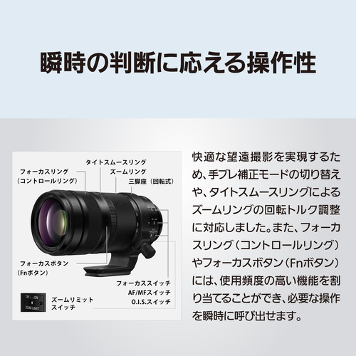 ・ズーム全域で高い解像性能を維持。開放絞りから細部までシャープで美しいボケ描写を実現 ・焦点距離100mmから500mmまでをカバー。別売テレコンバーター(※デジタルカメラ交換レンズ用テレコンバーター DMW-STC20装着時。テレコンバーター装着時は、本製品の焦点距離が150-500mmに制限されます。※)の装着で最長1000mm(※装着時はF値が2段分暗くなります。※)の撮影が可能