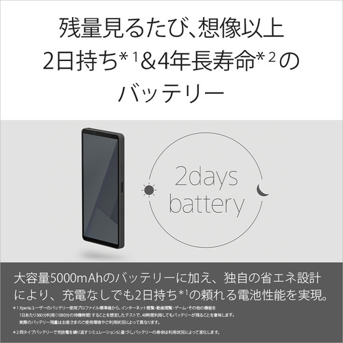 大容量5000mAh*3バッテリーと省エネ設計により、充電なしでも2日間の頼れる電池性能を実現。さらに、いたわり充電と充電最適化技術により、充電時のバッテリーへの負荷を軽減。4年間使い続けても劣化しにくい長寿命バッテリーへと進化しました。OSバージョンアップは最大4回、セキュリティアップデートは最長6年間に拡大*4し、長寿命バッテリーと合わせ、長期にわたって安心してご利用いただけます。*1Xperiaユーザーのバッテリー使用プロファイル標準値から、インターネット閲覧・動画閲覧・ーム・その他の機能を1日あたり360分利用(1080分の待機時間)することを想定したテストで、48時間利用してもバッテリーが残ることを意味します。実際のバッテリー残量はお客さまのご使用環境やご利用状況によって異なります。*2同タイプバッテリーで充放電を繰り返すシミュレーションに基づく。バッテリーの寿命は利用状況によって変化します。*3規格上の標準容量です。*4ご購入時期によってOSバージョンアップの回数やセキュリティアップデートの年数は異なります。
