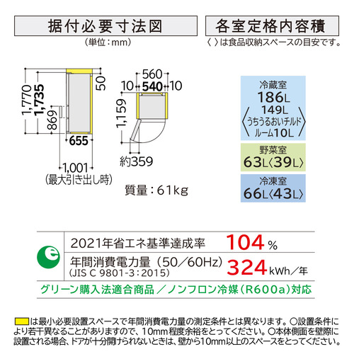 各室定格内容積(JIS C 9801:2015) (<>内は「食品収納スペースの目安」です。):冷蔵室186L<149L> 冷凍室66L<43L> 野菜室63L <39L>