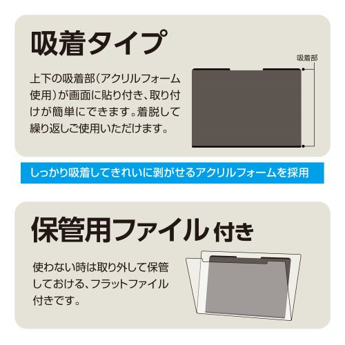 上下の吸着部(アクリルフォーム使用)が画面に貼り付き、取り付けが簡単にできます。着脱して繰り返しご使用いただけます。