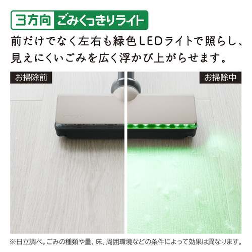 ヘッドに「パワフル スマートヘッド plus」を採用。ヘッドの前と左右の広い範囲を照らす「3方向ごみくっきりライト」を搭載。もっとも明るく感じる波長に近い緑色のLEDライトで見えにくいごみも浮かび上がらせます(※)。
