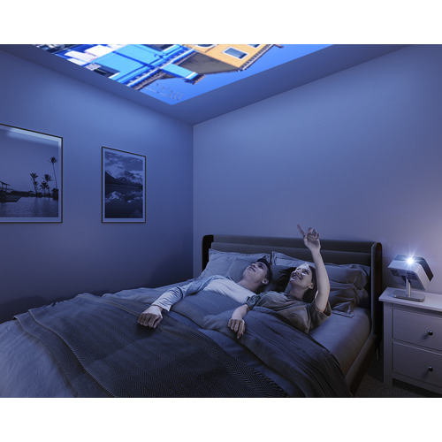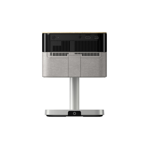 インテリアになじむ洗練されたデザイン。アンビエントライトを搭載し、お部屋をおしゃれに演出。フット付だから角度調整や天井投写が可能で、さらにオプションのフロアスタンドと組み合わせて設置場所を選ばず快適に映像を楽しめる。