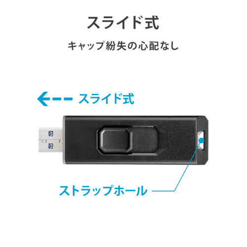 約23.5×68.8mmと、USBメモリー同等の小型サイズ。スライド式のため、キャップ紛失の心配もありません。また、ストラップホールも付いているので無くさないようにカバン等につけることも可能です。