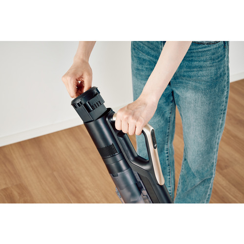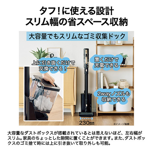 大容量なダストボックスが搭載されているとは思えないほど、左右幅がスリム。家具のちょっとした隙間に置くことができます。また、ダストボックスのゴミ捨て時には上に引き抜いて取り外しも可能。