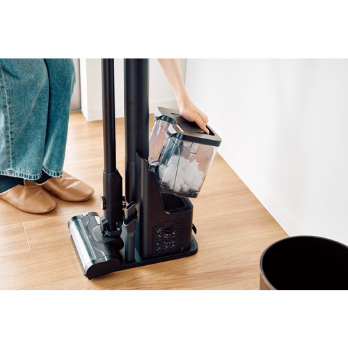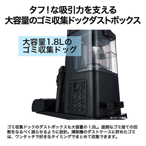 ゴミ収集ドックのダストボックスも大容量の1.8L。面倒なゴミ捨ての回数をなるべく減らせるように設計。掃除機のダストケースに貯めたゴミは、ワンタッチで好きなタイミングでまとめて収集できます。