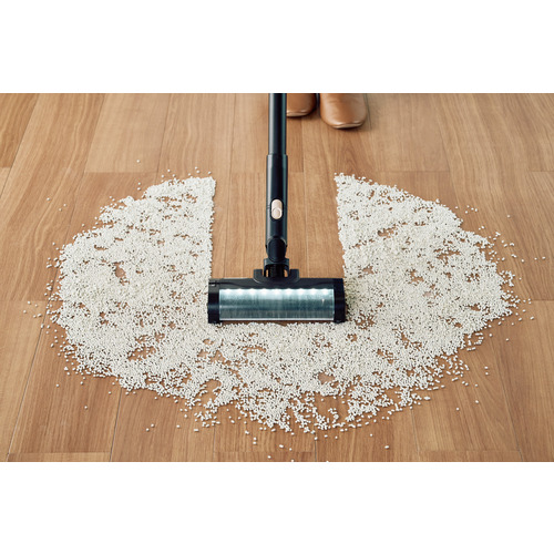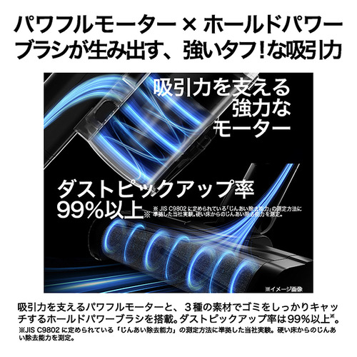 吸引力を支えるパワフルモーターと、3種の素材でゴミをしっかりキャッチするホールドパワーブラシを搭載。ダストピックアップ率は99%以上。