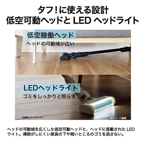 ヘッドの可動域を広くした低空可動ヘッドと、ヘッドに搭載されたLEDライト。掃除がしにくい家具の下や暗いところのゴミを逃さない。