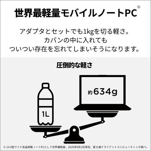カーボンやマグネシウムリチウム合金などの素材や、バッテリー、SSD、細かな部品など細部にまで及ぶ検討を重ね、14.0型ディスプレイ搭載パソコンとして世界最軽量の約634gを実現。