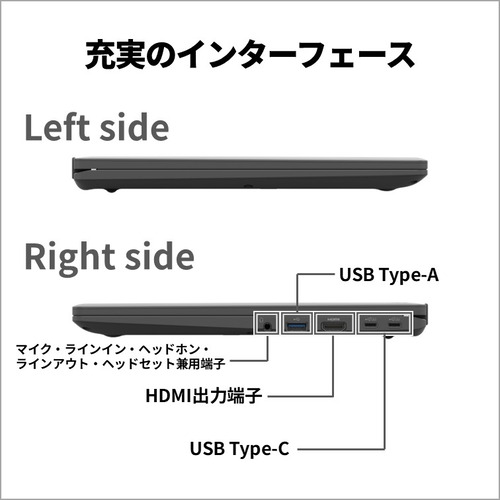 USBなどの端子類は右側面にまとめて、左側面はスッキリと。持ち運び時に美しく見えます。
