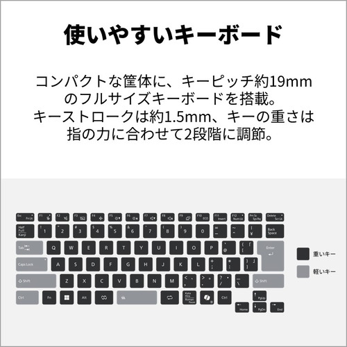 AI活用に便利な「Copilot キー」を搭載したキーピッチ約19mmのフルサイズキーボードは、キーストロークを約1.5mm、キーの重さは指の力に合わせて2段階に調整。