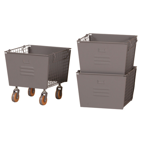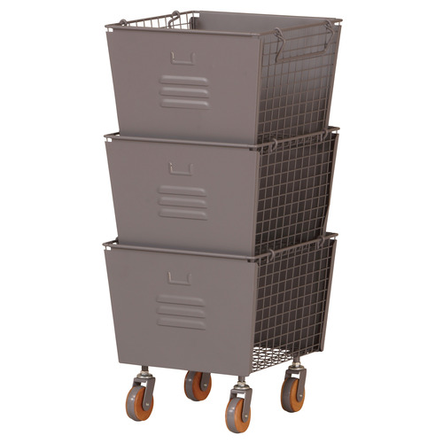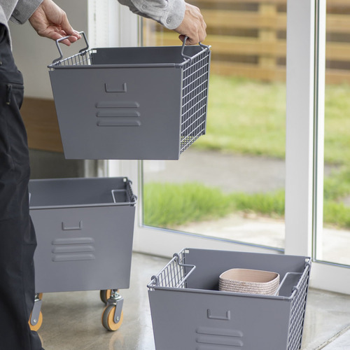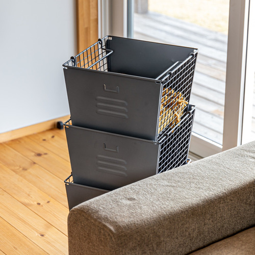 スチールロッカーをイメージしたような3段スタッキングボックスセットは、同じサイズのボックスが3つセットなので、積み重ねて使ったり、バラバラに使ったりとシーンに合わせて形を変えて使用ができる収納アイテムです。