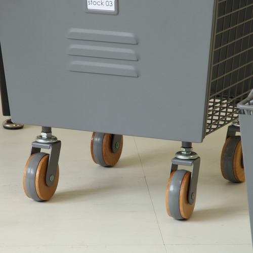 下段のボックスには天然木をあしらったキャスター付き。温かみのあるウッド素材が、冷たくなりすぎずに住居スペースに馴染みます。