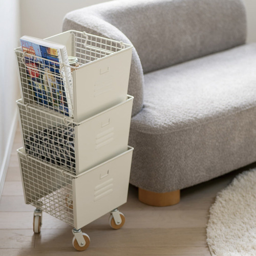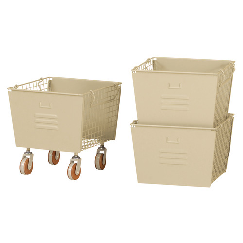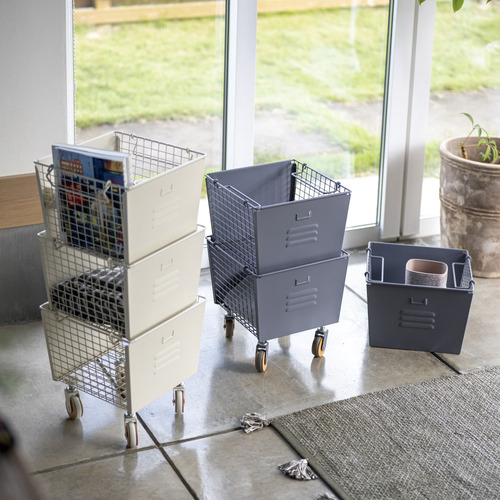 スチールロッカーをイメージしたような3段スタッキングボックスセットは、同じサイズのボックスが3つセットなので、積み重ねて使ったり、バラバラに使ったりとシーンに合わせて形を変えて使用ができる収納アイテムです。