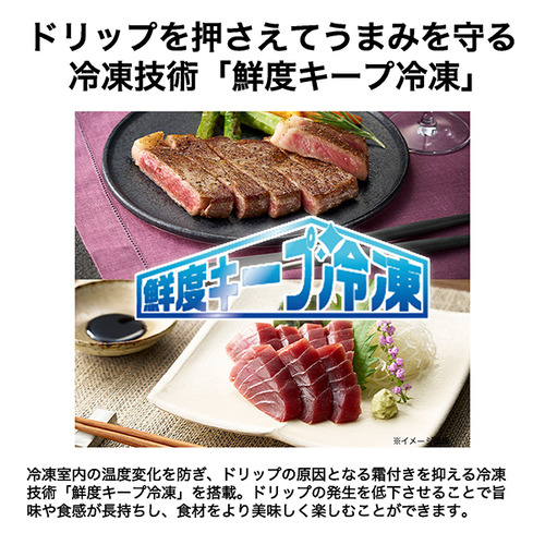 冷凍室内の温度変化を防ぎ、ドリップの原因となる霜付きを抑える冷凍技術「鮮度キープ冷凍」を搭載。ドリップの発生を低下させることで旨味や食感が長持ちし、食材をより美味しく楽しむことができます。