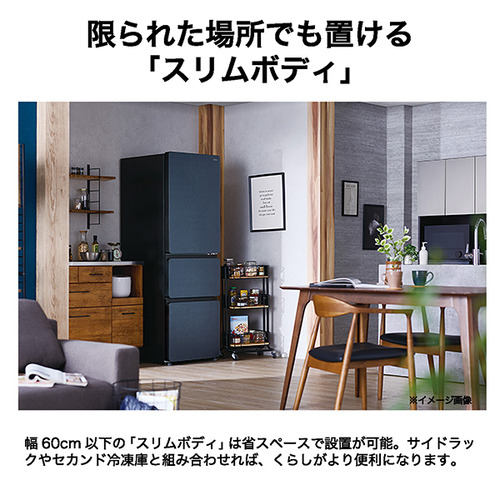 幅60cm以下の「スリムボディ」は省スペースで設置が可能。サイドラックやセカンド冷凍庫と組み合わせれば、くらしがより便利になります。