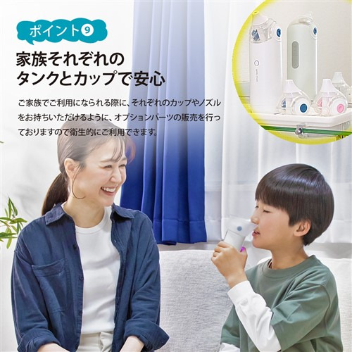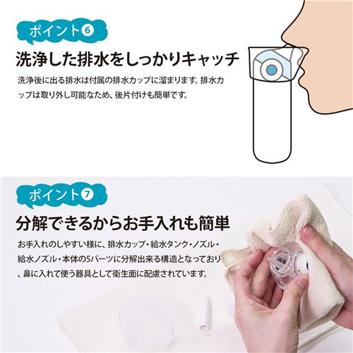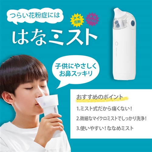 こまやかミスト(ミストサイズ10〜20マイクロメートル)で左右の鼻を貫通しないので痛くなくしっかり鼻洗浄
